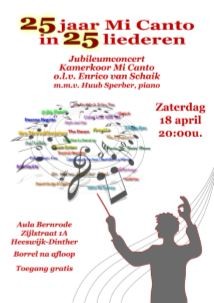 Het concert vindt plaats in de aula van Gymnasium Bernrode, Abdijstraat 36 te Heeswijk, en begint om 20.00 uur. Zoals altijd staat het koor onder leiding van Enrico van Schaik. Het koor wordt begeleid door Huub Sperber, de vaste pianist van Mi Canto. De entree van het concert is gratis. Na afloop heffen we graag samen met u het glas op 25 jaar Mi Canto.