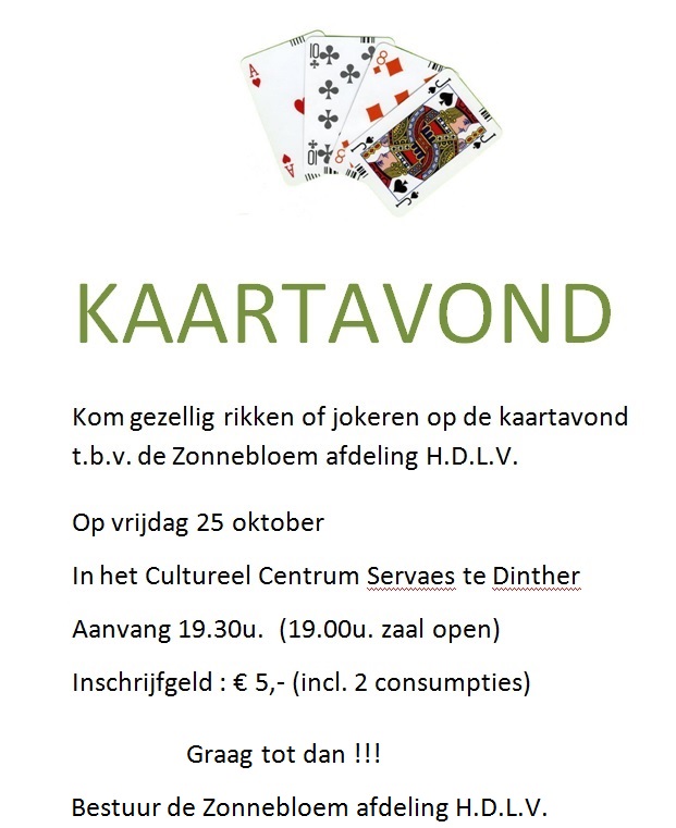 Op vrijdag 25 oktober houdt de Zonnebloem H.D.L.V. weer een kaartavond. Iedereen is welkom om te komen rikken of jokeren. Het Cultureel Centrum Serveas naast de Dintherse kerk is vanaf 19.00 uur geopend, waarna het kaarten om 19.30 uur zal starten. De vrijwilligers van De Zonnebloem hebben weer hun best gedaan mooie prijzen te verzamelen. Deze zijn tijdens deze avond te winnen. Tegen een entree van € 5,- krijgt iedere deelnemer twee consumpties.