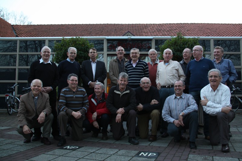 Met wat gezucht en gesteun wordt de klassenfoto gemaakt van ‘’de jongens van toen’’ op het kerkplein van de kerk van Dinther. Ze worden allemaal dit jaar 65 jaar, een reden, vond Jan van den Meulenbroek om een reünie te organiseren. Het idee ontstond eigenlijk al vijftien jaar geleden maar het werd toch weer op de lange baan geschoven. En nu moest het er dan toch maar eens van komen.