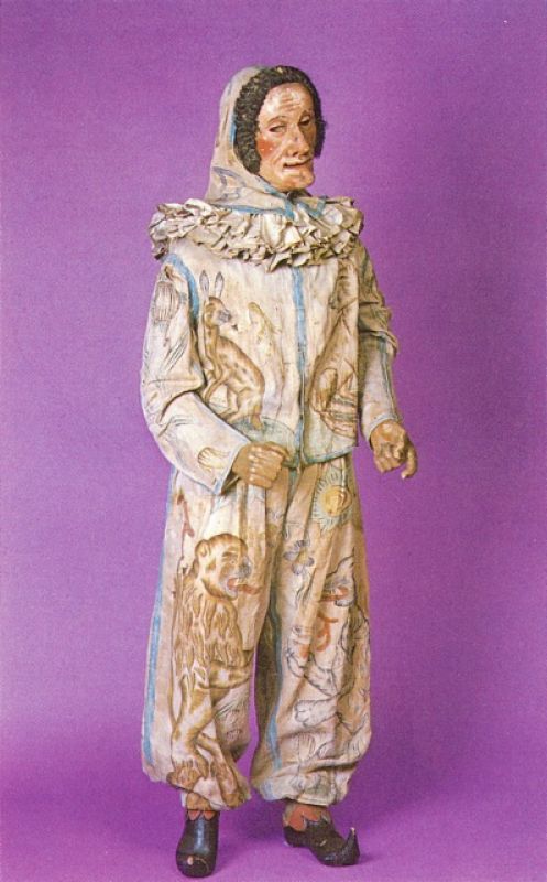 SPOORLOOS De hofnar werd al kort na de verkoop in 1975 doorverkocht. In 1978 dook hij nog op tijdens een antiekbeurs in Breda. Hij werd aangeboden door een antiekhandelaar en zou verkocht zijn voor een Duitse of Zwitserse verzameling. Sindsdien is hij spoorloos. De antiekhandelaar is overleden, de firma opgedoekt. In de catalogus van de veiling in Breda werd de pop omschreven als ‘Zwitsers carnavalskostuum. Gemaakt rond 1800. Hoogte 170 cm. Ex. collectie Heeswijk’.Vanwege zijn titel ‘de Nar van Heidelberg ‘ hebben we contact opgenomen met het Kurpfälzisches Museum in Heidelberg. Spoedig liet de conservator textiel van het museum ons weten dat er wel een Nar van Heidelberg bestaat die luistert naar de naam Perkeo en geboortig is van Zuid-Tirol, maar die lijkt in de verste verte niet op die van Heeswijk. Perkeo had de gestalte van een dwerg en zou in zijn leven alleen wijn hebben gedronken. Het museum in Heidelberg ziet meer gelijkenis met een Zwitserse of Zuid-Duitse carnavalsfiguur uit de ‘Allemanische Fastnacht’. Zo’n narkostuum wordt ‘Häs’ (pak) genoemd, heeft een uit hout gesneden masker en een pak van rijk versierd handwerk. Het narrenpak wordt traditioneel door dezelfde persoon levenslang gedragen en wordt vanuit de traditie gekoesterd. Ook de Heeswijkse pop heeft een houten masker, toont geborduurde dierfiguren en draagt een houten sabel, een bekend attribuut van zo’n carnavalsnar. Op de foto van de veiling in 1978 draagt onze nar geen sabel meer. We hopen nu via Zwitserse en Zuid-Duitse carnavalsmusea de ‘Nar van Heeswijk’ te kunnen opsporen.