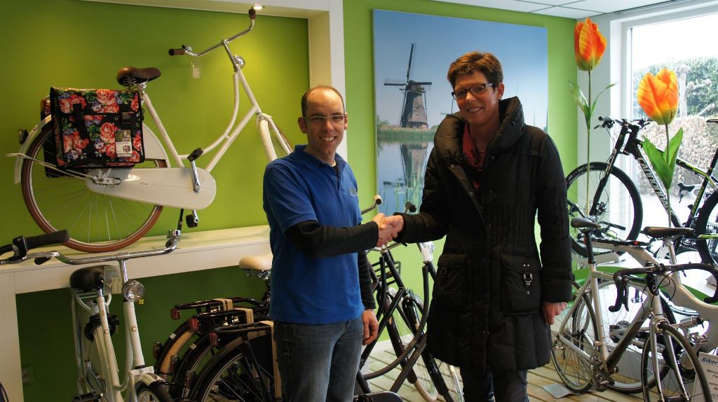 2013-03 Riky NijssenGezamenlijk zijn we de prijs gaan ophalen bij Fietsenhandel Bikers in de Hoofdstraat. In de geheel vernieuwde winkel van Bikers is de prijs van een GRATIS fietsonderhoud overhandigd door John de Mol aan Riky, een geweldige prijs.