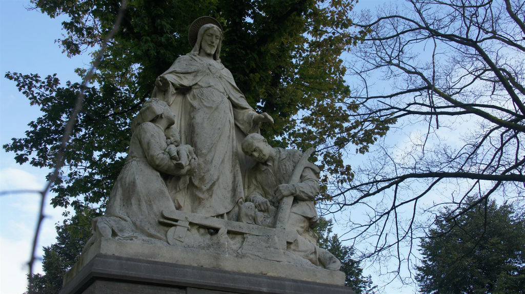 “De zandstenen beeldengroep bestaat uit een Christusfiguur, die zegenend zijn handen houdt boven een boerengezin. Rechts van hem een geknielde vrouw met kind en links van hem een geknielde man met een handploeg. De vrouw dracht een poffer, de man houdt een muts in zijn rechterhand.” M.M.