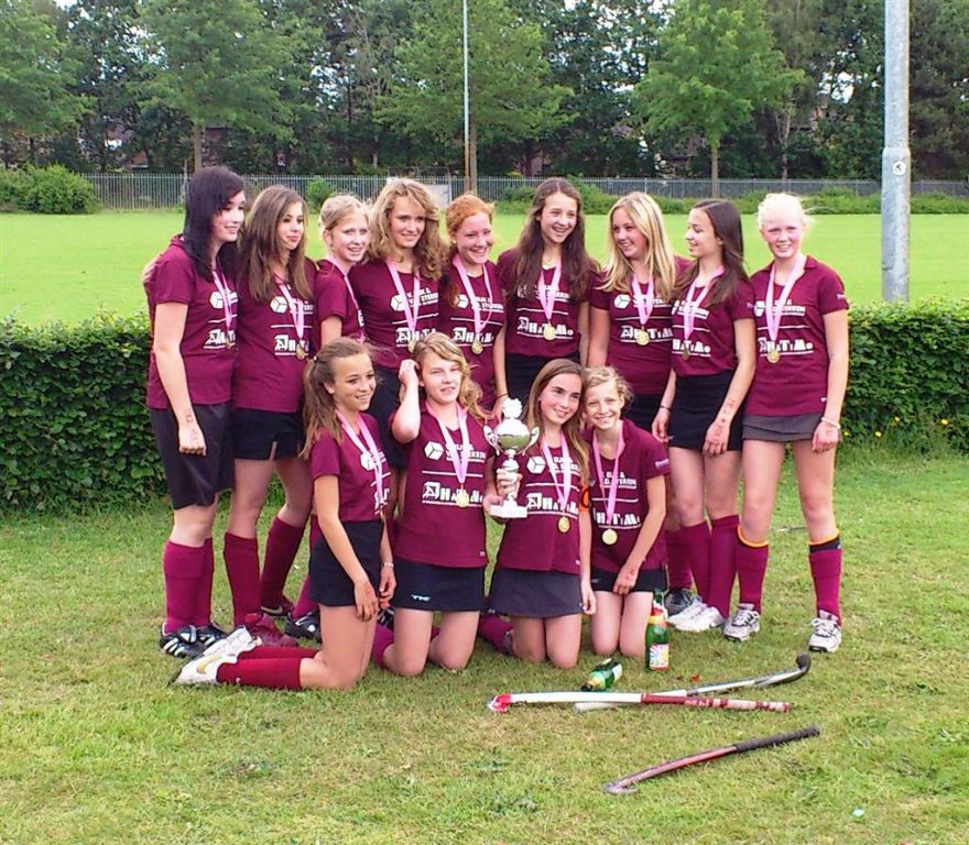 De hockeysters van HDL meisjes C2 behaalden dankzij een 4-2 zege op Uden het kampioenschap binnen. De champagneflessen werden geopend en de speelsters kregen ieder een medaille, die stralend om hun nekken hing. Een glimmende beker maakte het kampioenschap compleet. Naast de C2 stelden ook de meisjes E1 (foto onder) en de meisjes E2 het kampioenschap veilig.
