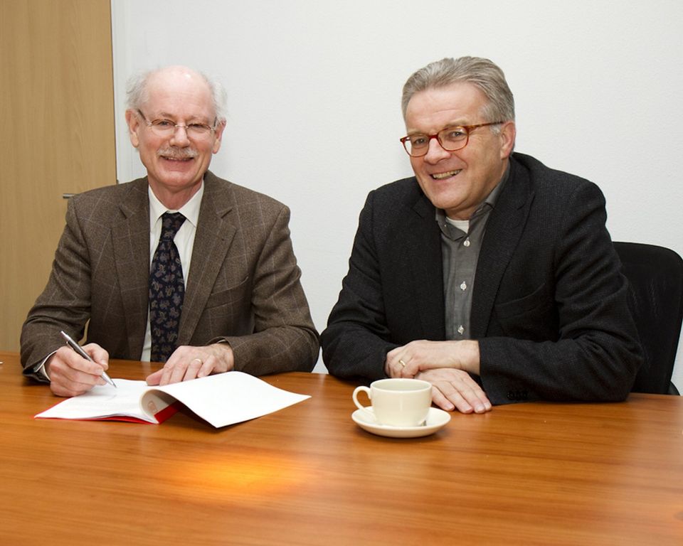 notaris laverhof-3 1600x1200Met het ondertekenen van een notariële akte bij notariskantoor Wedemeijer-Dielissen aan De Ballendonk is vanmiddag de fusie tussen BerneZorg en zorggroep Dorus officieel vastgelegd. Onder het toeziend oog van Mr. Dielissen tekenden Hans van de Wiel (l) en Wim van Meijl in beste verstandhouding de akte. Vanaf 1 jan 2013 wordt de nieuwe naam "Laverhof" officieel in gebruik genomen.