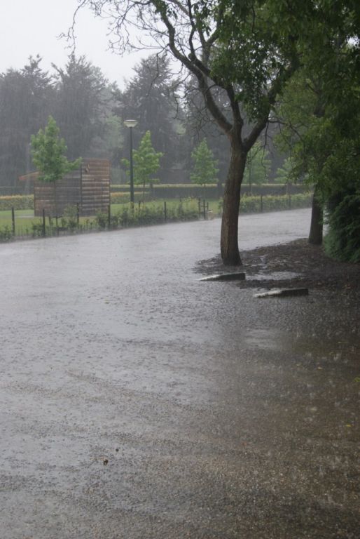 Gisteravond was er hier en daar al een druppel gevallen, maar het mocht weinig naam hebben. Vanaf een uur of acht waren de voorspellingen helder. Er komt een flinke hoosbui, met hele pittige buien, windstoten en onweer op ons af. Rond 11 uur was het zover. Pluvius zette de kraan wagenwijd open....voor even maar. Toen was het weer over en vanmiddag kwam het vertrouwde zonnetje weer terug.