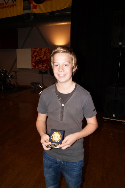 111008-lvdv-BKslagwerk_18{jcomments on}Thomas van der Ven, slagwerker van Harmonie Sint Servaes uit Dinther, is vanmiddag in Veldhoven Brabants Kampioen geworden in de hoogste slagwerkdivisie. Met 92 punten liet hij Wouter van Leeuwen en Jelle Leppink uit Sint Michielsgestel achter zich. Ook Fanfare Sint Willibrord uit Heeswijk was succesvol met een Brabants Kampioenschap voor een ensemble in de vierde divisie.