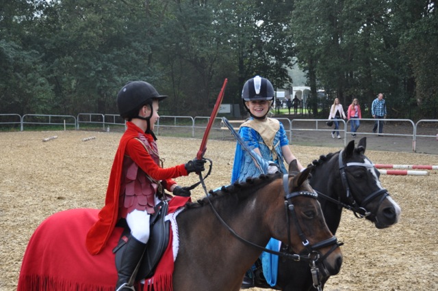 In de middagpauze was er voor de jeugdige ruiters een rubriek "de mooist verklede combinatie". Wat zijn er toch veel mooi verklede combinaties in de baan voorbij gekomen!! Zo liepen er onder andere kinderen verkleed met hun pony als koe, bruid, zorro, mega toby en spaanse dames. De jury had het er maar moeilijk mee, zo moeilijk zelfs dat hij niet 1 maar 2 winnaars heeft gekozen. Het waren broer en zus, Stan en Lieke van Gorkum, die met hun pony's Didi en Blacky verkleed waren als ridder en hiermee de 1e plaats behaalden.