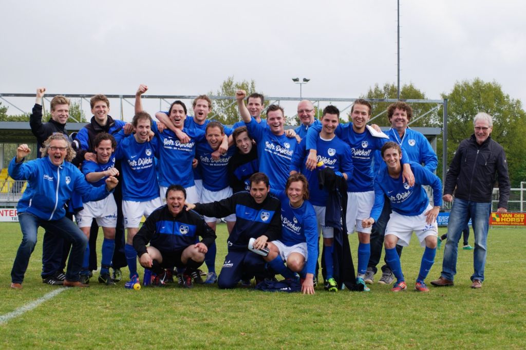 Linksback Hein van Nuland en de nog ingevallen goalgetter Frank Dobbelsteen nemen afscheid van Heeswijk 1 als trotse 2e klasser! Aan nieuwe trainer Marc van de Ven de uitdaging om dit resultaat volgend jaar te herhalen.