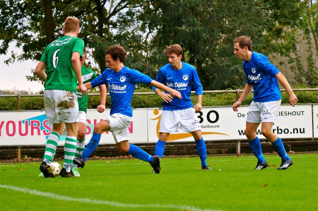 De wedstrijd begon dan ook afwachtend van beide kanten. Heeswijk mocht opbouwen van achteruit en probeerde via het middenveld de spitsen gevaarlijk te laten worden, terwijl de groen-witten via de opkomende backs enkele keren dreigend werden. Beide doelmannen hadden in het eerste half uur het geluk dat een bal op de deklat verdween, echt grote kansen bleven in de gelijkopgaande strijd verder uit. Na een half uur was daar dan toch de Heeswijkse voorsprong. Een perfecte corner van Turgay Arslan werd keihard door, wie anders dan, topscoorder Wouter van Dijke achter de kansloze Fabio Neijts gekopt. Sparta ‘25 drong daarna iets meer aan, maar het defensieve blok van de mannen van Gebr. Dijkhoff en Viking Entertainment bleef overeind.