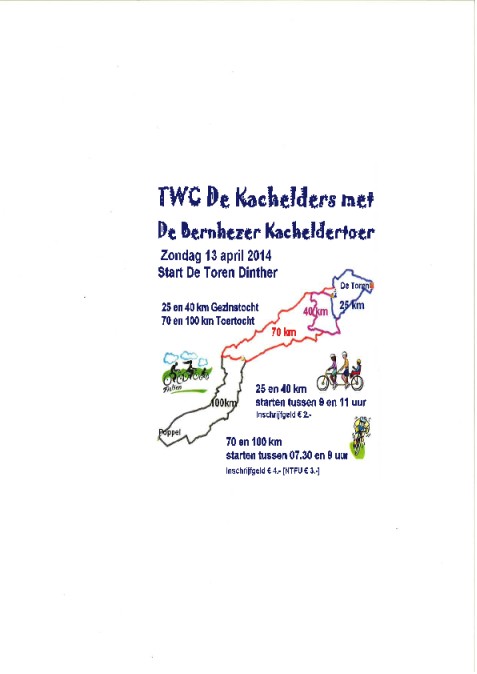 TWC de Kachelders organiseert zondag 13 april samen met WSC-Bernheze voor de eerste keer “De Bernhezer Kacheldertoer”. Een mooie toertocht voor iedere fietsliefhebber.